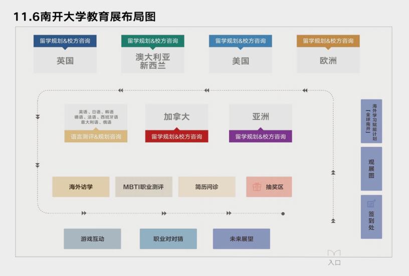 本届教育展由“励志励学讲座”“‘全球南开’项目”“海外院校资讯”“留学申请规划”和“生涯规划问诊”五个模块构成,下设15个活动区域(其中,田家炳音乐厅1个,风雨操场14个),每人每区域最多可获一枚印章。