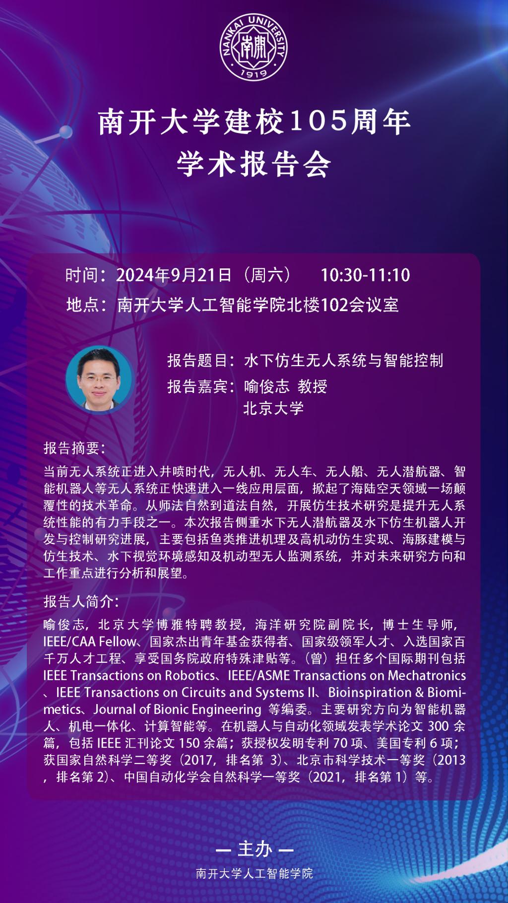 报告3:水下仿生无人系统与智能控制 报告人:喻俊志 教授(北京大学) |