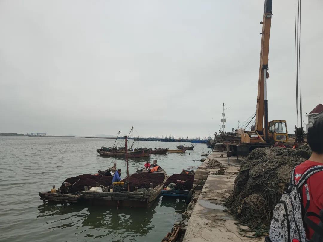 在一位当地水产养殖负责人的带领下,我们来到了杏树街道的水产养殖基地,踏上雨后满是泥泞的道路前往渔港,一深一浅的脚步中,我们感受到了渔民们的辛苦,夹杂着海草腥味的海风令内陆的同学感到些许不适。