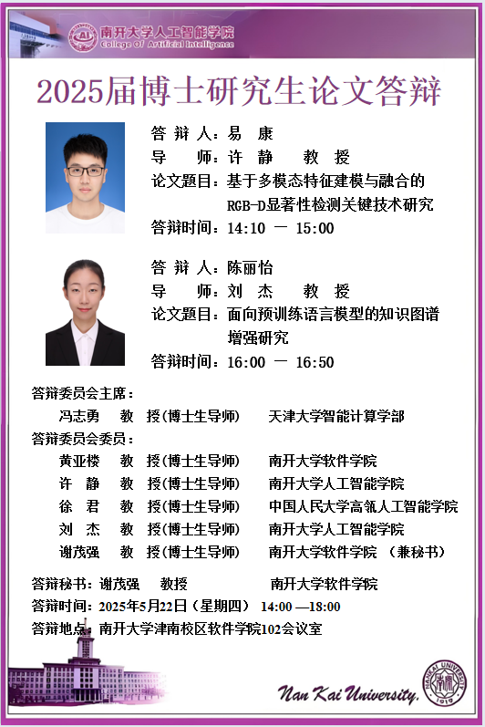 【答辩】2025届夏季毕业答辩公告----机器智能研究所(博士)